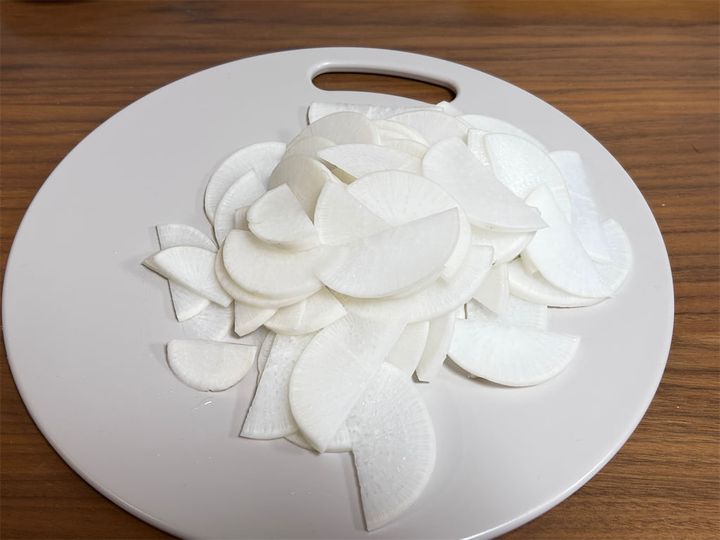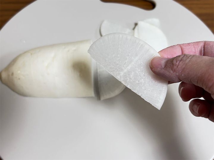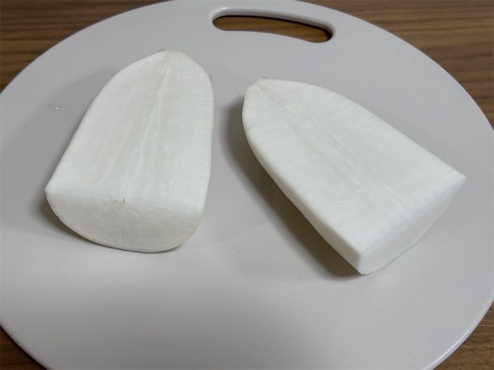 1.大根を縦半分に切ります。皮は剥かなくて大丈夫です。