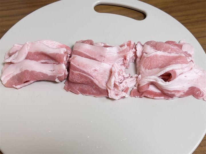 2.次に豚肉を食べやすい大きさにするために、3等分に切ります。