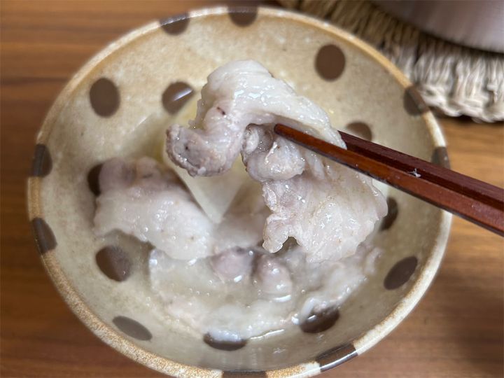 薄く切った大根につゆがしっかりしみこんでいます。まさにおでんつゆ鍋ですね!