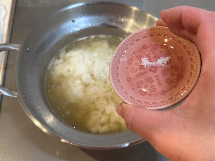 塩を入れて、弱火でフツフツとなるまで加熱します。