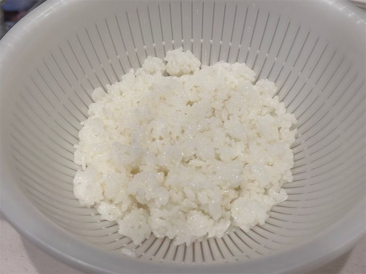 あらかじめ炊いておいたご飯を、サッと水で洗います。ご飯の粘り気を取って、サラッとした仕上がりにするためです。