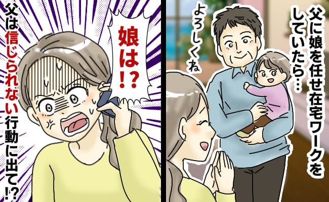 ある日、実家で在宅ワークをしていた私は、父に隣の部屋で娘を見てもらうよう頼みました。しかし1時間ほど経過し、ふと隣の部屋を覗いたところ、2人の姿が見えないことに気づきます。すぐに家中を探したのですが見つからず、私は不安な気持ちに。