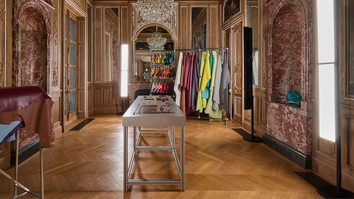 アンダーソンが今季の会場に選んだのは、かつてカール・ラガーフェルド(Karl Lagerfeld)が住んでいた18世紀の邸宅のオテル・ド・メゾン。1階と2階にある17のテーマに別れた部屋を巡るという、珍しいコレクションの発表方法をとった。邸宅に入ってすぐに私たちを出迎えてくれたのは、巨大なかぼちゃのオブジェ。これまでもロエベが協業を続けてきた英国人アーティストのアンセア・ハミルトン(Anthea Hamilton)による彫刻で、ランウェイショーやキャンペーンに登場し、店頭にも飾られていたことからロエベファンには馴染みのある作品だ。このように、会場には過去の協業アーティストによる作品が各部屋に展示されており、「あの時のあれ!」といううれしい発見があった。