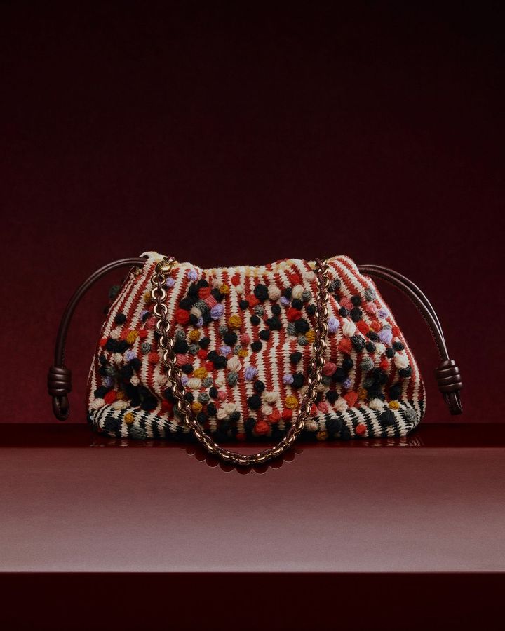 またアーカイブから選んだ妻アニの5つの代表的なテキスタイル作品を、メカニカルウィービングで忠実に再現し、コートや“フラメンコ”バッグなどに採用。特徴的なドットのモチーフは、約7000個の飾り玉を手作業で縫い付けて表現しているという作り込みだ。