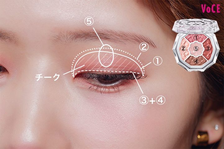 1:2色を混ぜて涙袋のすぐ下、頬のかなり上の位置に楕円形に。高い位置にのせることでジワッと血色感が出てバブみがアップ