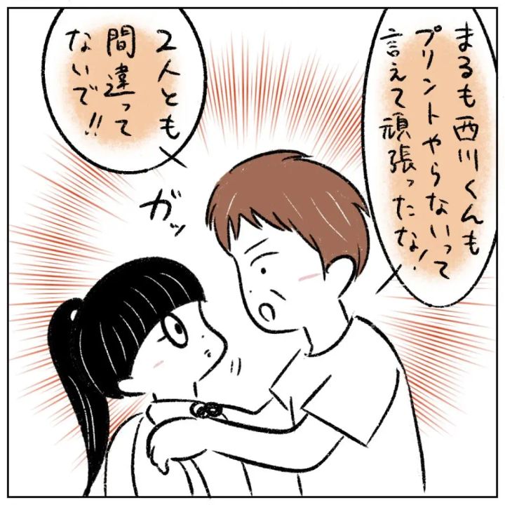 「まるも西川くんもプリントやらないって言えて頑張ったな!2人とも間違ってないで!」そう言ってまるさんの両肩をしっかりとつかみました。