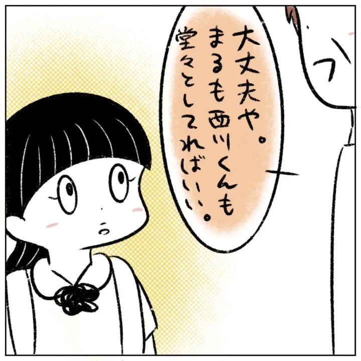 「大丈夫や。まるも西川くんも、堂々としてればいい。」お母さんの力強い言葉にまるさんもハッとしました。