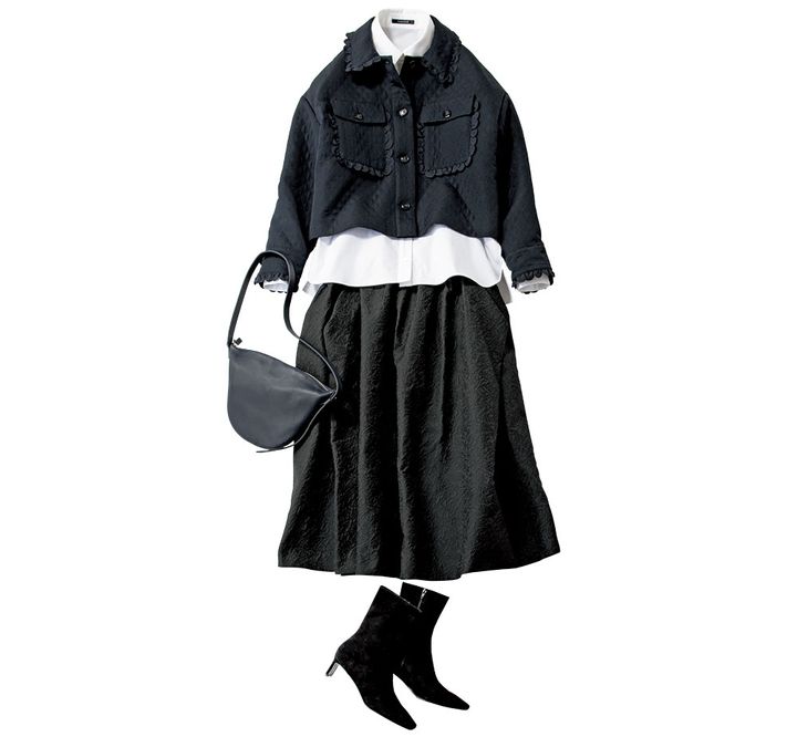 紺黒の繊細なコントラストが織りなす大人の甘コーデ。やさしげな印象のネイビーフリルジャケットの初々しさをブラックスカートがハンサムに受け止めてくれるから、好感度もキリッと感も両得してくれそう。白シャツをチラ見せして、軽やかさをONすれば、地味色コーデもしっかり着映え、高揚感もキープできます。