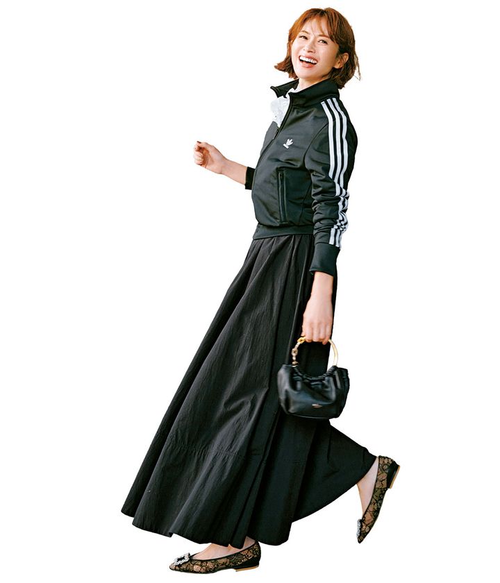 空前のスポーティブームに乗るならシックな黒が味方に。甘ブラウス×ドラマチックスカートなど、コンサバさんのいつものオシャレに一さじのスポーティマインドを。きれいめ小物でリッチに纏めて。