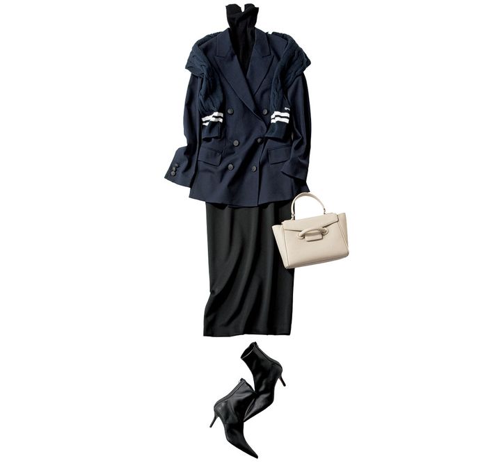 王道定番アイテム同士も配色の妙でグッと新鮮見え。ジャケットやニット、タイトスカート……、ベーシックな手持ちアイテム同士を重ねてもネイビー×ブラック合わせなら知的でモードなスタイルに。