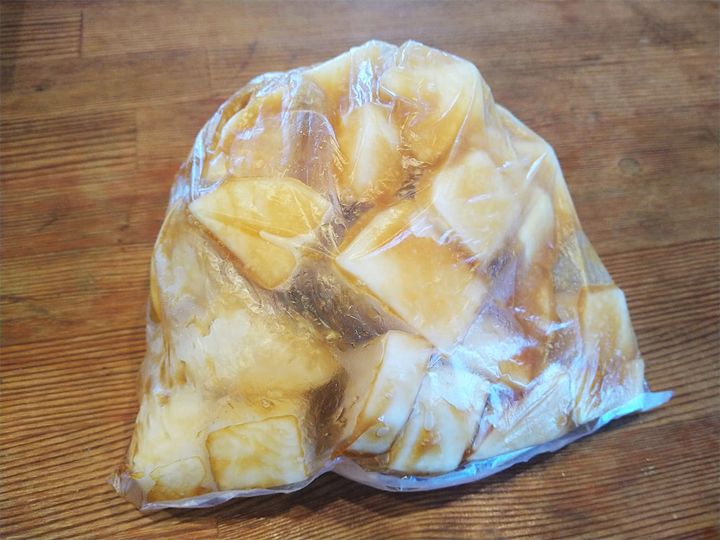 2. 1をポリ袋の中入れ、しょうゆ、しょうが、にんにく、白だしを加えてよくもみ込みます。