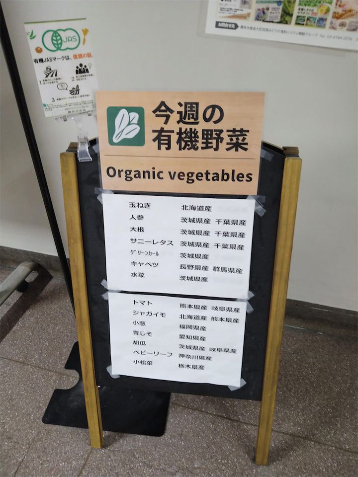 入り口には、食堂で使われている有機野菜の産地が書かれたボードが!