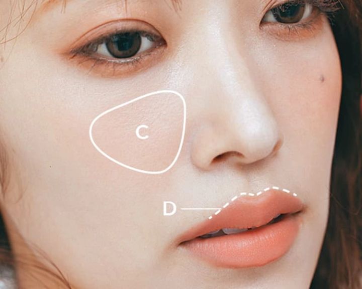 Cを指にとり、顔の中央寄りのほおに逆三角形になじませる。