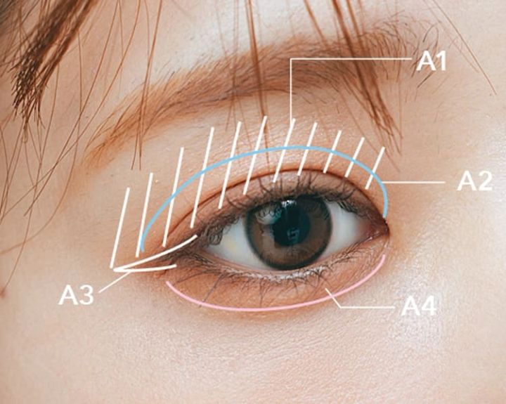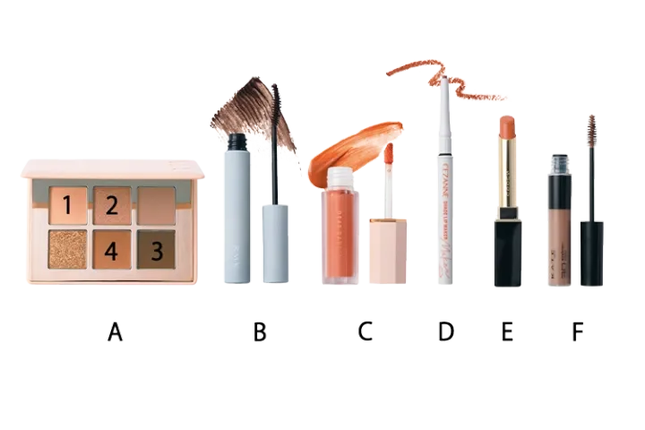 A1をアイホールに、A2を二重幅より広めに重ねたら、目尻のきわにA3を入れる。下まぶたはA4のみをさらっとオン。上下まつ毛にBを塗る。眉毛もFで存在感薄めにカラーリング。