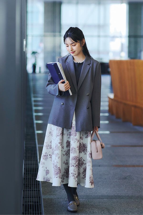 通勤服に花柄スカートを取り入れるなら、さりげない柄を意識して。先輩OLなら、大柄やくっきりとしたタッチの水彩フラワーで、大人の気品を感じさせて。ベーシックカラーなら年相応の落ち着いたムードが確保できます。