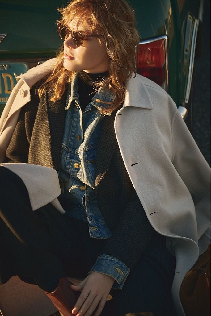 黒タートルネックセーターは上のアイテム。ブルーデニムジャケット /Lee(エドウイン・カスタマーサービス) 千鳥柄ジャケット/THIRD MAGAZINE リバーコート、黒タックパンツ/ともにSTERNBERG(アダストリア カスタマーサービス) サングラス/プロポ(プロポデザイン) カーキバッグ/LUMEN(office. koizumi.) 茶ブーツ/STACCATO(バロックジャパンリミテッド)