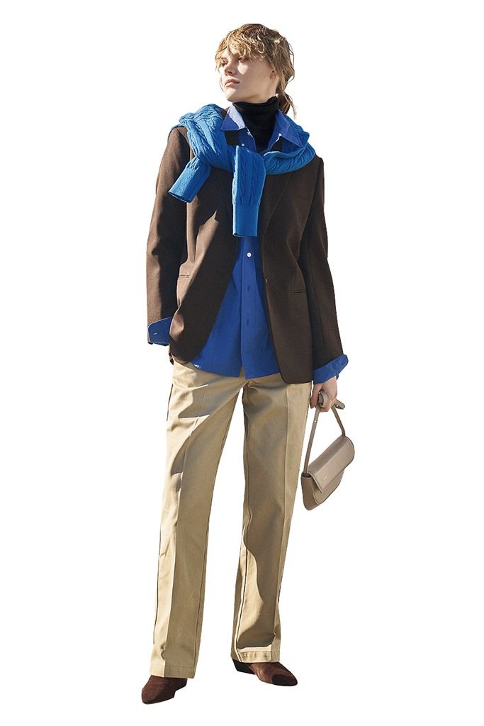 黒タートルネックセーターは着まわし。ブルーシャツ/THE SHINZONE(Shinzone ルミネ横浜店) ブラウンジャケット/バナナ・リパブリック 肩にかけたブルーニット/THE SHINZONE(Shinzone ルミネ新宿店) ベージュチノパンツ/ディッキーズ ベージュバッグ/ミウール(ショールーム セッション) 茶ブーツ/バナナ・リパブリック