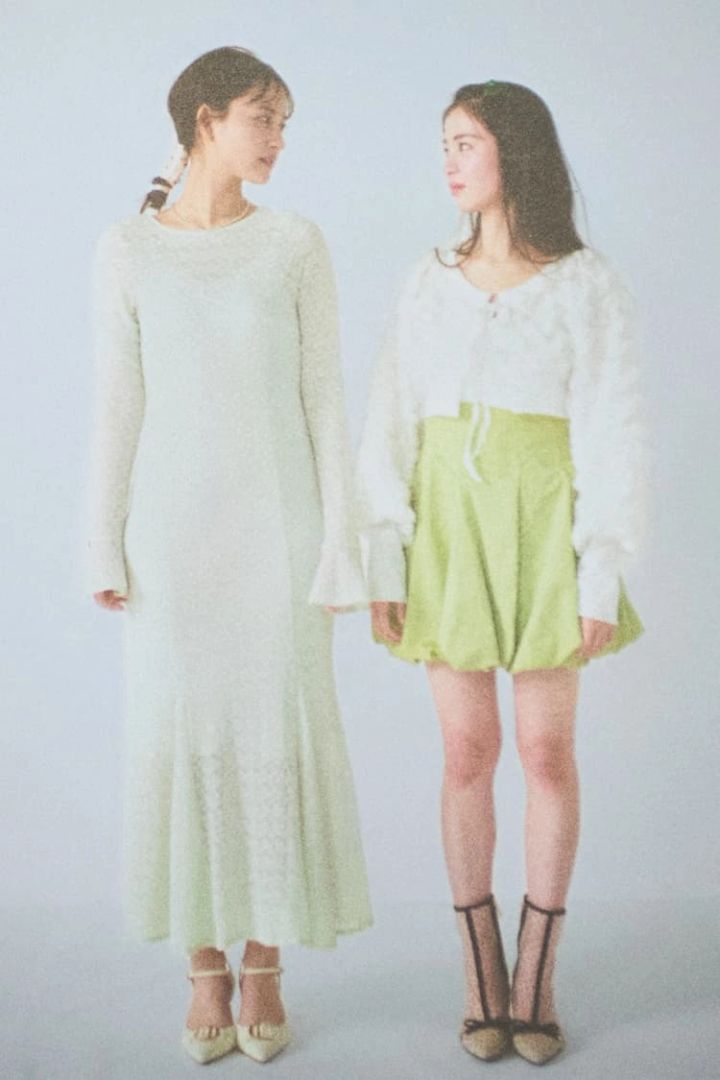 〈左・金川紗耶のコーデ〉ミントグリーンレースワンピース(3月発売予定)13,750円/dazzlin パールとチェーン2連ネックレス 2,970円/アネモネ(サンポークリエイト)パンプス 9,900円/RANDA ヘアリボン/スタイリスト私物〈右・三浦理奈のコーデ〉グリーンバルーンミニスカート(3月発売予定)14,300円/MERCURYDUO ルミネエスト新宿店 白フロントリボンカーディガン 16,280円/lilLilly(lilLilly TOKYO)ヘアピン(2本セット)1,320円/アネモネ(サンポークリエイト)ドット柄シアーブーツ 14,960円/RANDA インナー/スタイリスト私物
