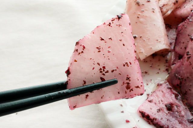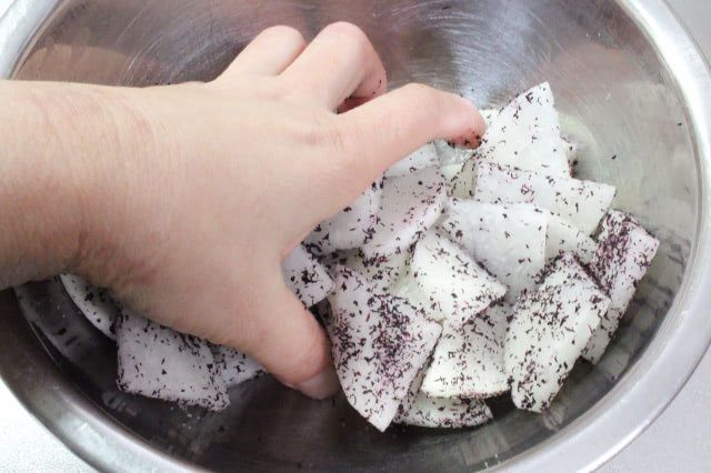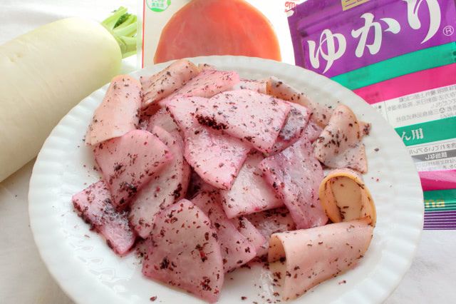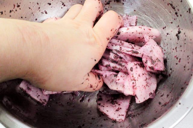 赤じそふりかけと塩で塩揉みした大根が、こちら。鮮やかなピンク色に染まり、大根とは思えない仕上がりです。