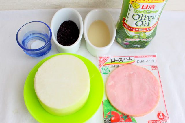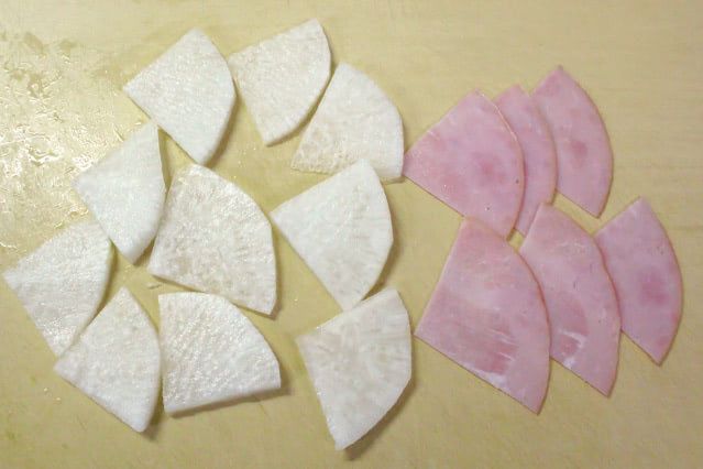 1. 大根の皮を剥いて、薄いいちょう切りにします。ハムもいちょう切りにします。