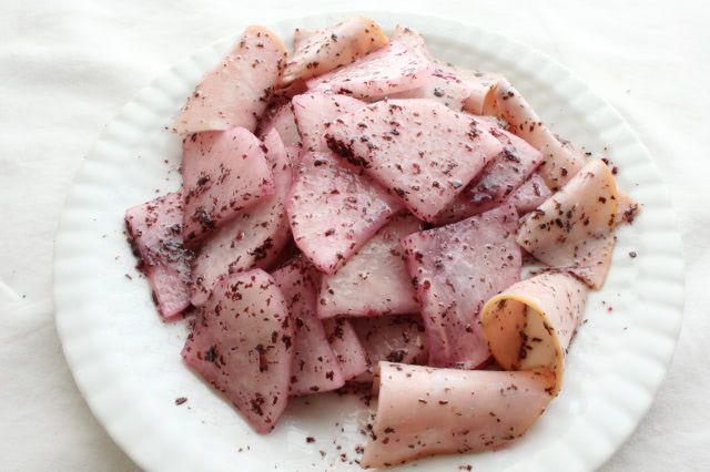 ハムを食べたら、表面に赤じそふりかけが付いていますが旨味はしっかり。大根に比べて極薄なので、やわらかい食感です。