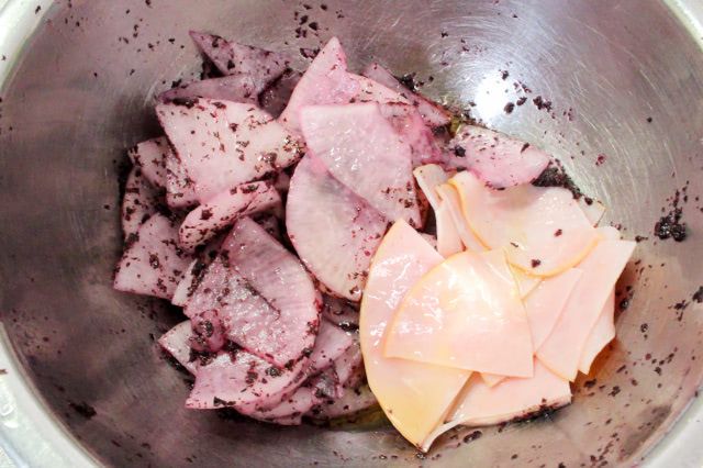 3. 【ゆかり】で和えればピンク色♡大根とハムで「大根の赤じそサラダ」作ろう!あ、よく見るとハム入ってる♪