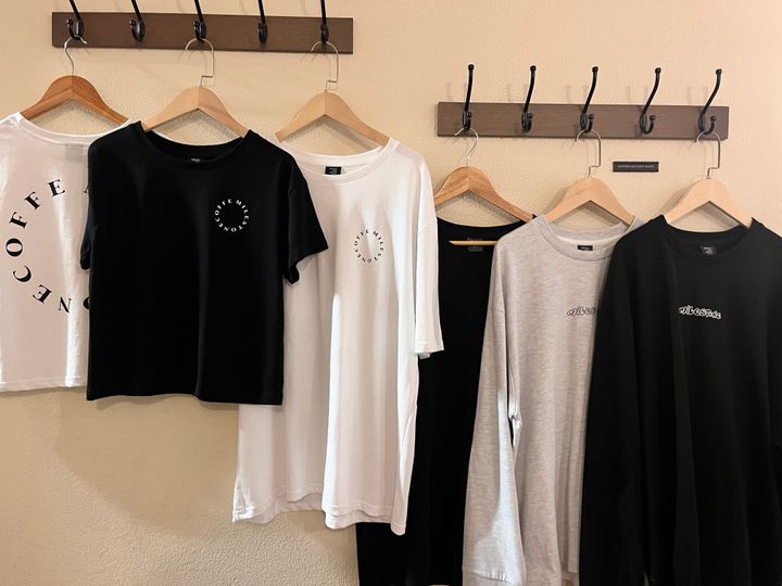 コーヒー豆はもちろん、オリジナルのマグカップやTシャツ、巾着など幅広く展開しています。