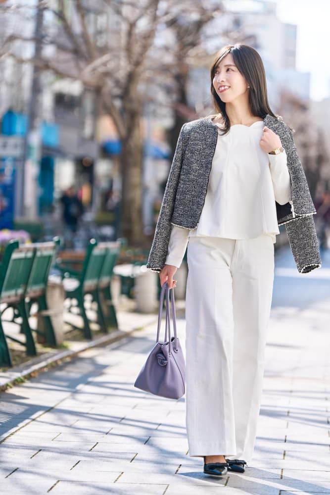 ツイードジャケットを主役に!白デニムで親しみやすく