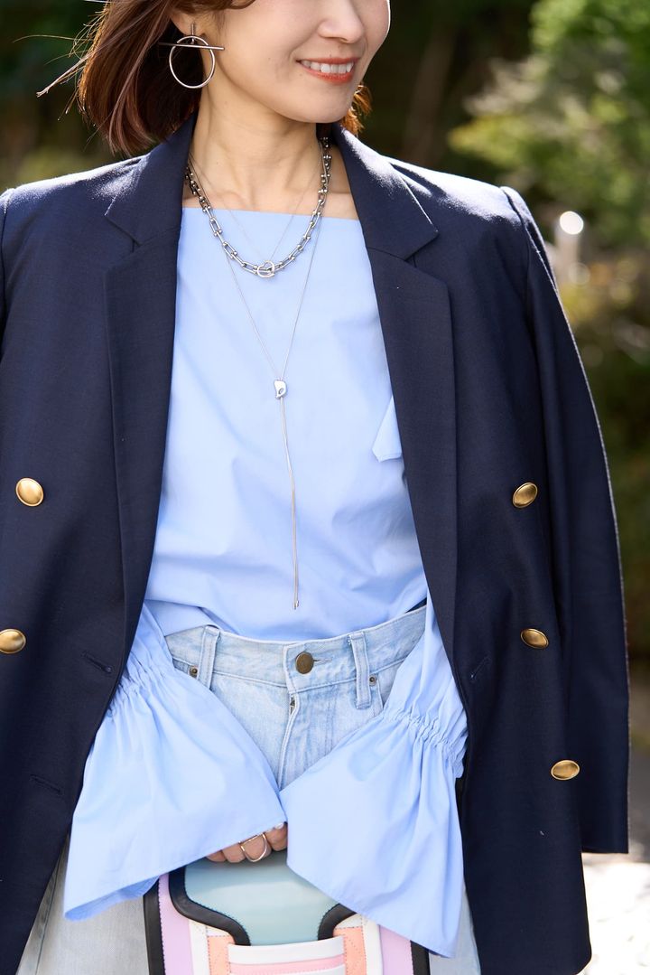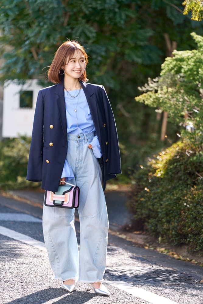 トップスとデニムをライトブルーで揃えたワントーンコーデにネイビージャケットを肩掛けしてグラデーションカラーに。爽やかで品のある春コーデに仕上げました。ジャケットの下はオフショルトップスを合わせたヘルシーな肌見せで、女性らしい抜け感も意識しています。さらに今っぽいシルエットのカーブデニムをプラスして最旬コーデにアップデートしました。