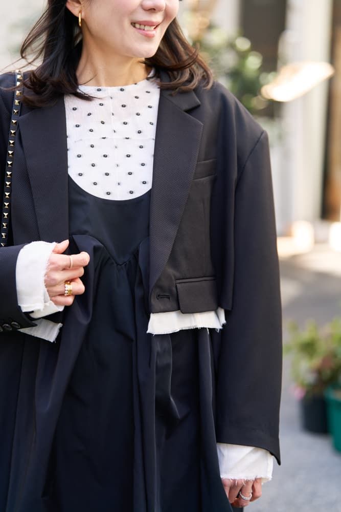 丈の短いジャケットにデザイン性のあるミニワンピースを合わせ、全体のバランスを意識しました。目線が上がることで脚長効果も期待できます。このジャケットは袖や裾の切りっぱなしデザインがポイントで、お手頃価格ながら他にはないデザインなのが優秀。シンプルコーデに羽織るだけで一気にトレンド感も出せるので、1枚持っておくと重宝します!