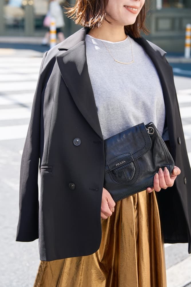 プチプラのジャケットを安っぽく見せないコツは、大人きれいめなモノトーンコーデに仕上げること。ボトムスはワイドパンツでマニッシュな雰囲気を出し、ゴールドアクセを重ね付けして華やかさをプラスしました。さらに、存在感のあるPerrinの大きめバッグを合わせることで、シンプルな色味の中にもメリハリを演出。小物使いでグッと高見えする、大人のモノトーンコーデの完成です。