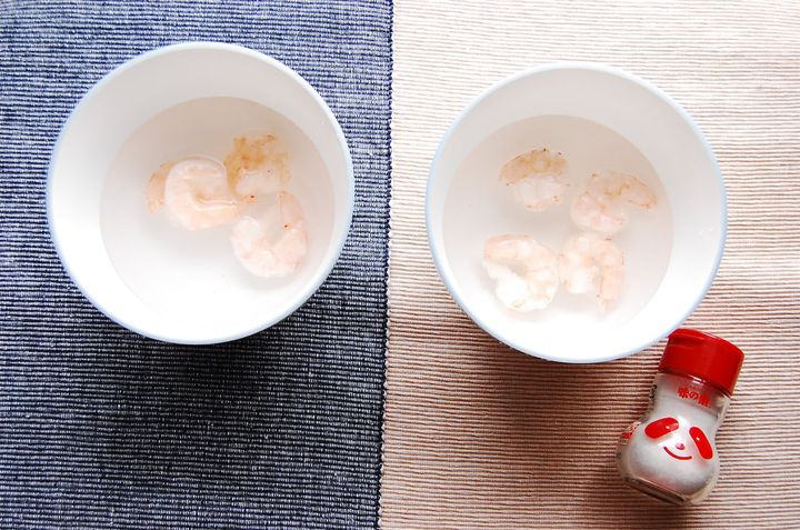 また、リュウジさんがやっていたように、「味の素®︎」の効果がわかりやすいよう、水200mlと塩小さじ1で解凍したエビも用意。それぞれ解凍したエビを、油で炒めて食べ比べることにします。ちなみに、塩水だけで解凍する方も、エビの量は同じ60gとします。