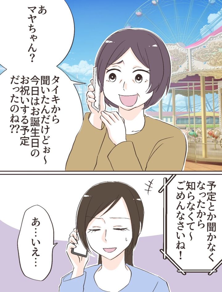 義母はテーマパークから電話をかけてきて「タイキから聞いたんだけどぉ~、今日はお誕生日のお祝いをする予定だったのね?予定とか聞かなくなったから知らなくて~。ごめんなさいね!」と言いました。「悪かった」という気持ちは微塵も感じられない口調。私は「あ・・・いえ・・・。」とこたえるしかありませんでした。