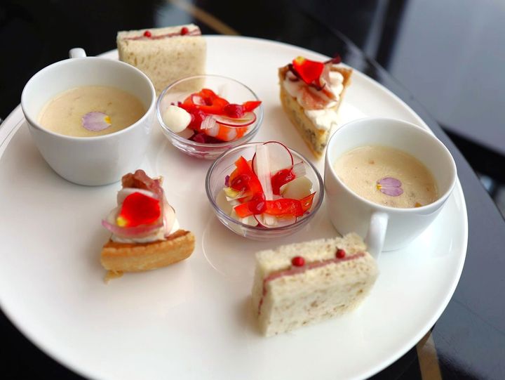 セイボリーのプレートも充実!あさりや玉ねぎなど素材のうま味を引き立てた真っ白なスープ、海老と帆立に春野菜を合わせ、フランボワーズドレッシングでサラダ仕立てにした一品や、優しい味わいのポテトサラダにパストラミビーフを合わせたサンドウィッチ、生ハムを添えた根菜の食感を楽しめるキッシュが楽しめます。
