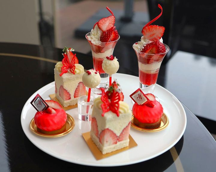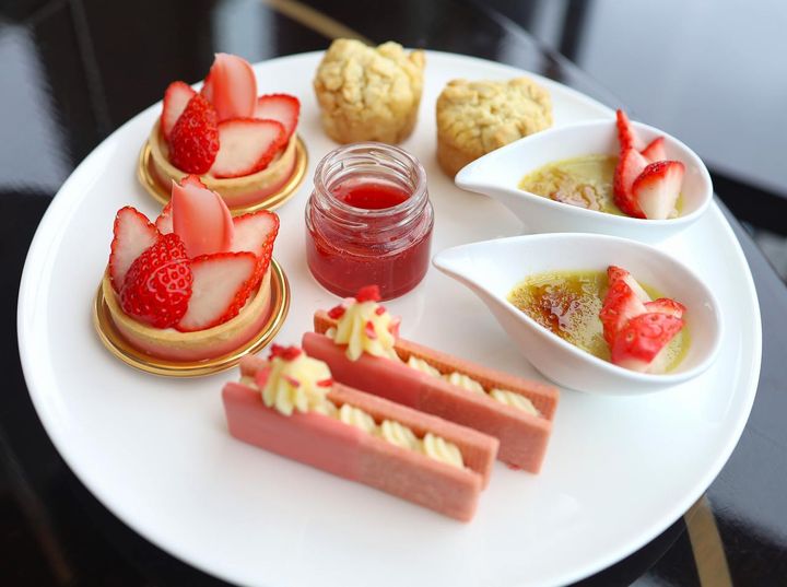 下段:いちごガナッシュサブレ、べにたまとピスタチオのクレームブリュレ、べにたまのタルト、スコーンショコラ・ホワイト いちごのコンフィチュール添え