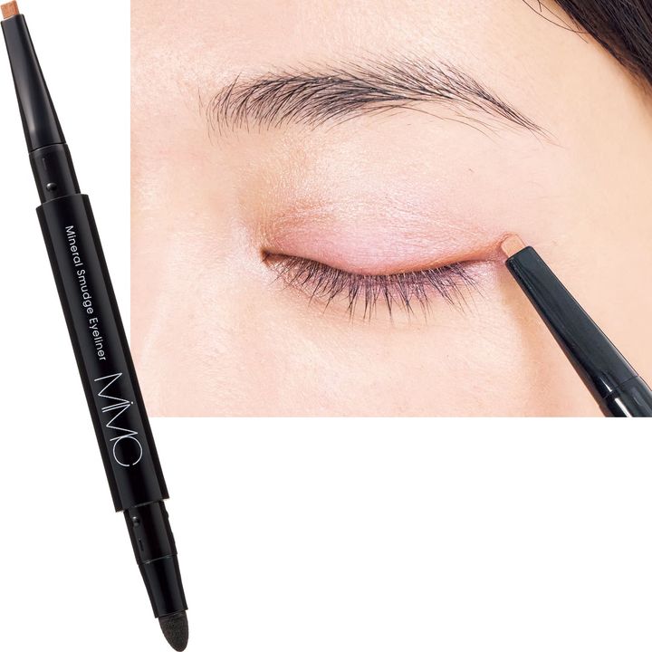 目幅を出したいのでゴールデンコーラルのアイラインを上まぶたの目尻1/3に入れます。黒のラインを入れてしまうと、アイラインだけが悪目立ちして目が小さく見えてしまいます。また、目の印象が弱い人は目頭から目尻まで。MiMC ミネラルスマッジアイライナー 05 ゴールデンコーラル ¥3,300(MIMC)※1/29発売