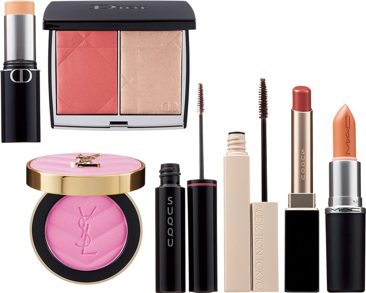 上段左から:ディオールスキン フォーエヴァー スキン パーフェクト スティック 2N ニュートラル¥7,370、柔らかな血色とゴールドハイライトで立体感。ディオールスキン ルージュ ブラッシュ カラー&グロウ 257 ディオリビエラ ¥8,470(ともにパルファン・クリスチャン・ディオール)下段左から:頰の中心にピュアな発色のピンクを。YSL メイクミーブラッシュ パウダー No.42 ベビードール ピンク ¥8,360(イヴ・サンローラン・ボーテ)眉とまつ毛にブラウン系ニュアンスカラー。SUQQU カラーリング アイブロウ 03 モーヴ ¥3,520(SUQQU)アディクション ザ マスカラ カラーニュアンス WP “サイレンスト セレニティ” 002 Rusty Brunette ¥4,180(ADDICTION BEAUTY)※限定色、ヌーディカラーの重ね塗りで立体感を。SUQQU ベルベット フィット リップスティック 04 夕桃 -YUUMOMO(セット価格)¥5,830(SUQQU)M・A・C マキシマル スリーク サテン リップスティック ピーチストック ¥4,620(M・A・C)