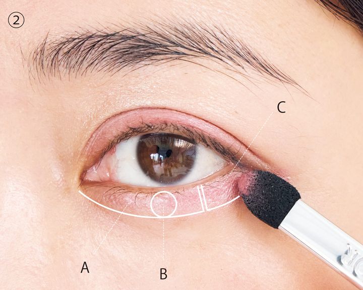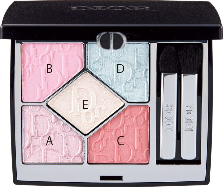 ①Aをブラシに取り、目尻からアイホール全体にぼかします。次にBのピンクをチップに取り、黒目の上に塗布。Cをチップで二重幅にアイラインより少し太めに入れます。Eをチップで、目頭にチョンと重ねて、Dの水色をブラシに取り、ピンクを入れた上に重ね、目頭側へぼかすと立体感と透明感が深まります。②さらにAを下まぶた全体に重ねます。チップを立てて目尻1/3の際にCを入れ、Bのピンクを黒目の下に。CとBを入れた上にさらにAのモーヴカラーを重ねて境目を馴染ませます。