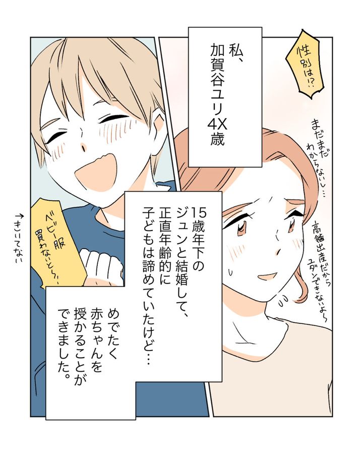 私、加賀谷ユリ4×歳。15歳年下のジュンと結婚して、正直年齢的に子どもは諦めていたけど・・めでたく赤ちゃんを授かることができました。