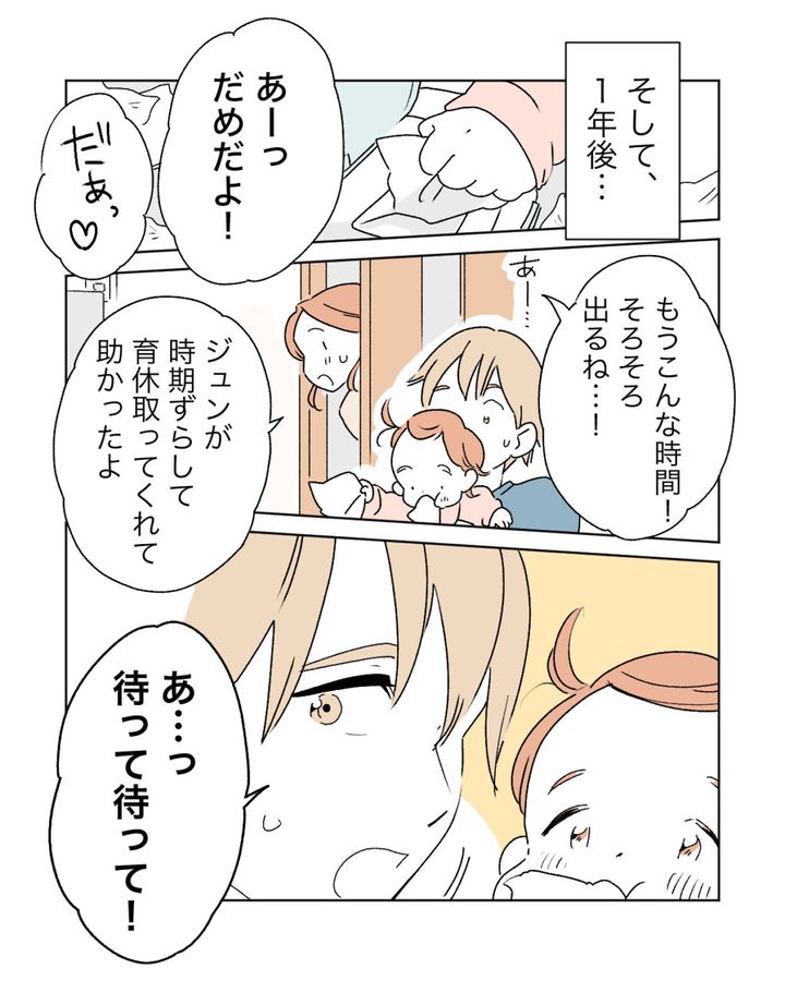 そして1年後・・。朝、ジュンが子どものお世話をしている横で私も慌ただしく自分の準備。「もうこんな時間!そろそろ出るね・・!ジュンが時期ずらして育休取ってくれて助かったよ」そう言いながらバタバタと家を出ようとすると「待って待って!」とジュンが子どもを抱いて玄関まで見送りに来てくれました。