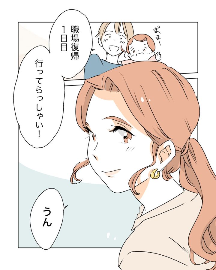 「職場復帰1日目、行ってらっしゃい!」育休を終え、今日から仕事に復帰する私はジュンと子どもに見送られ家を出ました。