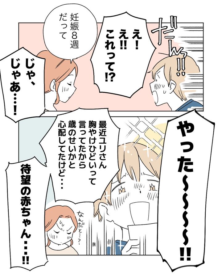「え!え!!これって!?」前のめりで聞いてくるジュンに「妊娠8週だって」と伝えました。すると、「やった~~~~!!」と喜びを爆発させたジュン。「最近ユリさん胸やけひどいって言ってたから歳のせいかと心配してたけど・・待望の赤ちゃん・・!!」と若干失礼なことを言いながら妊娠をとても喜んでくれました。