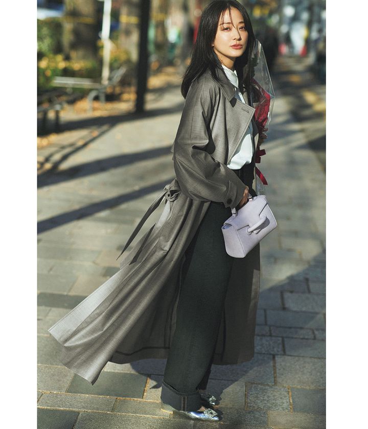 着流しのコートにベーシックなシャツ。黒デニムで引き締めれば大人の余裕さえ感じるクールな着こなしに。デニムパンツ¥14,300(サムシング/エドウイン・カスタマーサービス)コート¥143,000(サクラ/インターリブ)シャツ¥35,200(ナゴンスタンス)バッグ¥50,600(ヴァジック/ヴァジックジャパン)パンプス¥40,700(PIPPICHIC/ベイジュ)
