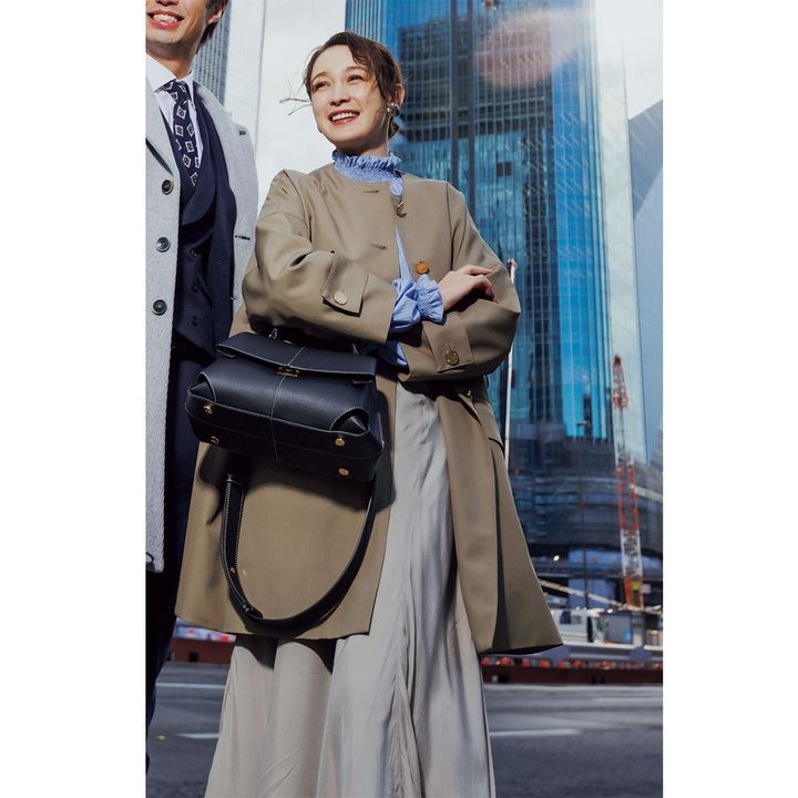 5.ノーカラーコート¥129,800(マッキントッシュ/マッキントッシュ ギンザシックス店)ツヤスカート¥25,300(カデュネ プレスルーム)バッグ¥98,000(ポレーヌ カスタマーサービス)イヤリング¥14,300(マージョリー・ベア/ココシュニック新宿タカシマヤ店)ブルーブラウス着回し