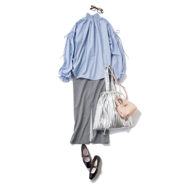 4.スカート¥13,200(SNIDEL)バッグ¥105,600(ロンシャン/ロンシャン・ジャパン)サブバッグ¥9,900(ELENDEEK)シューズ¥24,200(銀座かねまつ/銀座かねまつ6丁目本店)メガネ¥44,000(アイヴァン/アイヴァン 東京ギャラリー)ブルーブラウス着回し