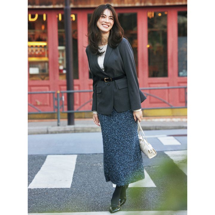 丈が長めなジャケットにベルトをキュッ。Xラインを作ることで上半身と下半身のボリュームを整えてくれます。スカート¥19,800(ストラ)ジャケット¥57,200(ブランベール/ウールン商会)トップス¥2,970(AUNT MARIE’S/アンティローザ)ベルト¥13,200(ルーニィ)バッグ¥6,990(MANGO) 靴¥33,000(ファビオ ルスコーニ/伊勢丹新宿本店 本館2 階 婦人靴)ピアス¥173,800 リング¥61,600(ともにココシュニック)タイツ/スタイリスト私物