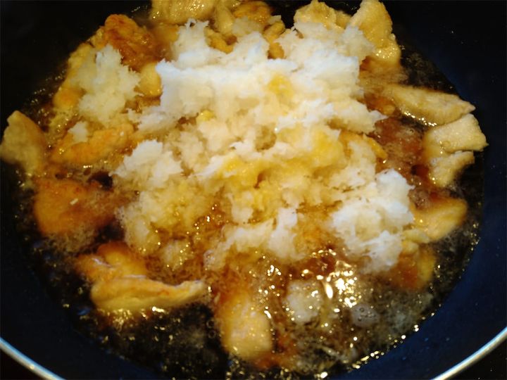 5.  水、めんつゆ、おろししょうが、大根おろしを加えて5分ほど煮たら完成。