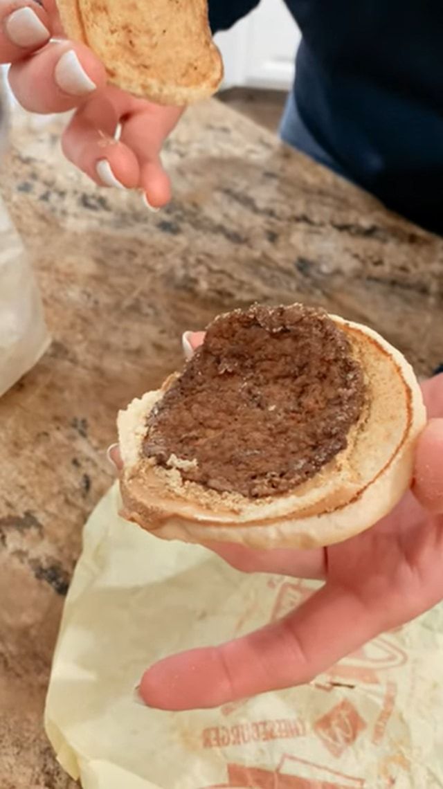 バンズの中を開けると、チーズは無くなっているように見えます。 ビーフの縁についている黄色の部分がチーズだということです。