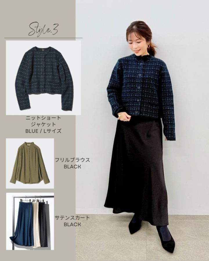 ブルーのニットショートジャケットなら、ぐっと落ち着いた印象にまとまります。華やか過ぎない上品なカラーコーデに仕上がっていますね。地味になりがちなダークカラーのジャケットコーデには、サテンスカートでツヤ感をプラスするのがおすすめです。