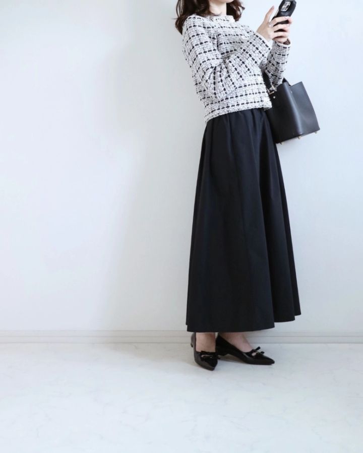 オフホワイトのニットショートジャケットは、明るく清楚なコーディネートを叶えてくれる頼れるアイテム。ブラックのロングスカートも、華やかに着こなせますよ。ブラックのパンプスやバッグをあわせれば、大人の女性にぴったりなオケージョンコーデにまとまります。